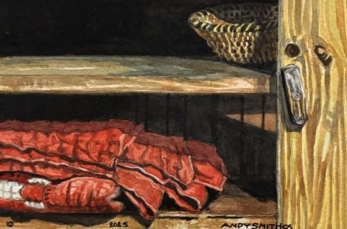 Description: A quilt and basket in a cabinet