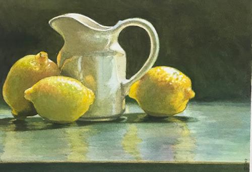 Description: There is a marvelous intensity in the yellow of the lemons, sending a warm glow across the counter and the pitcher. The reflective milky white pitcher adds an overall harmony to the scene. Add a bit of sugar and you just know you will have refreshing lemonade.