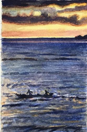 Description: #9 Boat on the Water... This was from my miniature cruise series painted on the ship 2 7/8 x 4 4/8"