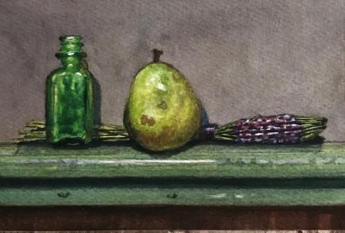Description: I still have some pears hanging around so I put together another still life. This time I grabbed a small green bottle and this lavender thing... ok I have been informed it is a lavender wand, handmade by our extra creative friend Lynne! I just liked the color!
