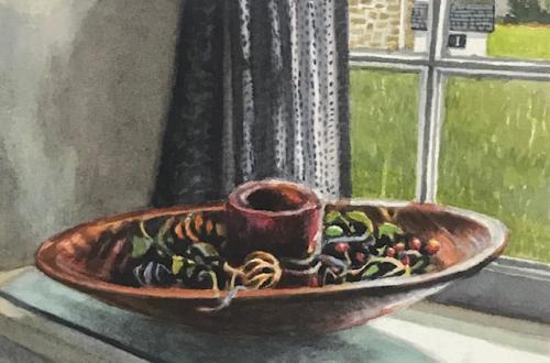 Description: Another great window scene. This one has a wood bowl filled with potpourri and a candle. I am most interested in the contrast of light and dark.