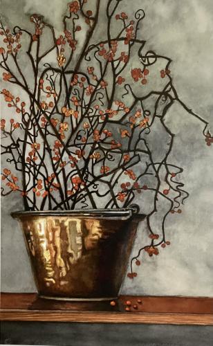 Description: The bittersweet vine is so beautiful but also unruly. It fits nicely in this copper bucket! The red berries signal the end of Fall, Winter is coming...
