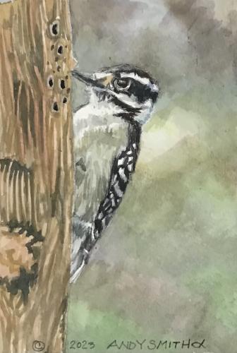 Description: A female downy woodpecker, doing what woodpeckers do!