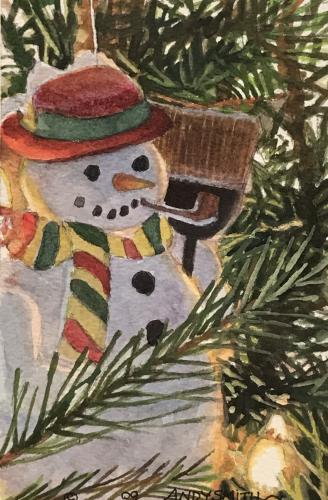Description: Featuring a snowman ornament from our tree. This was actually a paper pulp ornament that Linda made and painted years ago. It is hanging in a tree with lights.