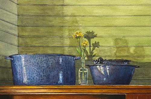 Description: Three beautiful old enamelware pots. I added a flower in an old bottle.