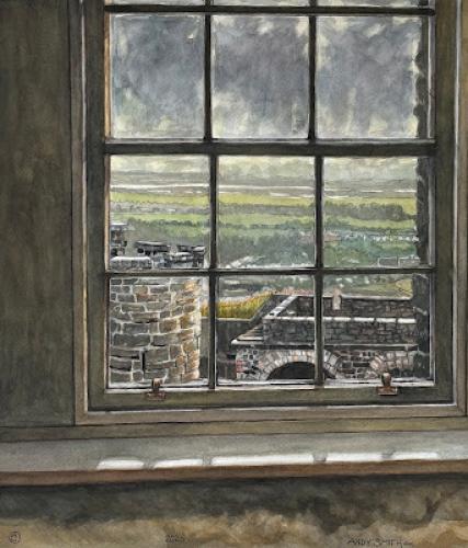 Description: I love the view, inside the castle looking out over the landscape on a rainy day.