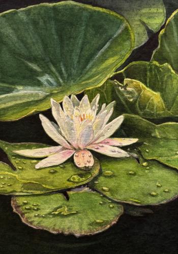 Description: Your eye goes to the waterlily first, then to the interesting water droplets.