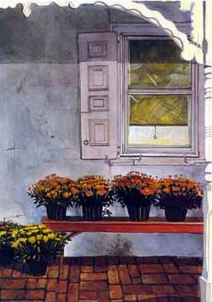 Description: Andy Smith wanted to share his love of mums with you. Continuing his reputation for rich use of color, light and shadows, with his knack for finding overlooked locations, he is offering you a painting of Autumn. This allows you the opportunity to savor the season long after the leaves have fallen.