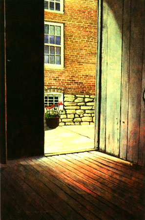 Description: This print has a certain magic. It features an extraordinary dance between the cool shadows inside and the warm sunlight outside. There is a feeling of being immersed in history. You are placed inside, standing in the shadows. You sense the cool dampness and you notice the patina on the worn floorboards. Looking out, your gaze catches the bright leggy geraniums. Soaking in the sunshine, you ponder what lies beyond the "Alley Walkway".