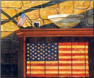 Description: Remembrance is my way of giving honor to all who have come before me. I wanted to express a deep meaning in this print. To me, the stone wall background signifies strength, and the antiques are a symbol of endurance over time. The old painted flag represents freedom while the new brighter flag portrays responsibility. We are the caretakers of both our possessions and of our country.