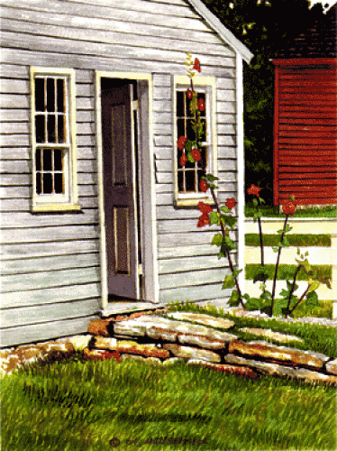 Description: At first glance this paintig appears simple, a plain freshly painted white building. It is the open door that invites you in. Can you see the shelves filled with clay pots and bags of soil all stored in this gardeners favorite place... the potting shed.